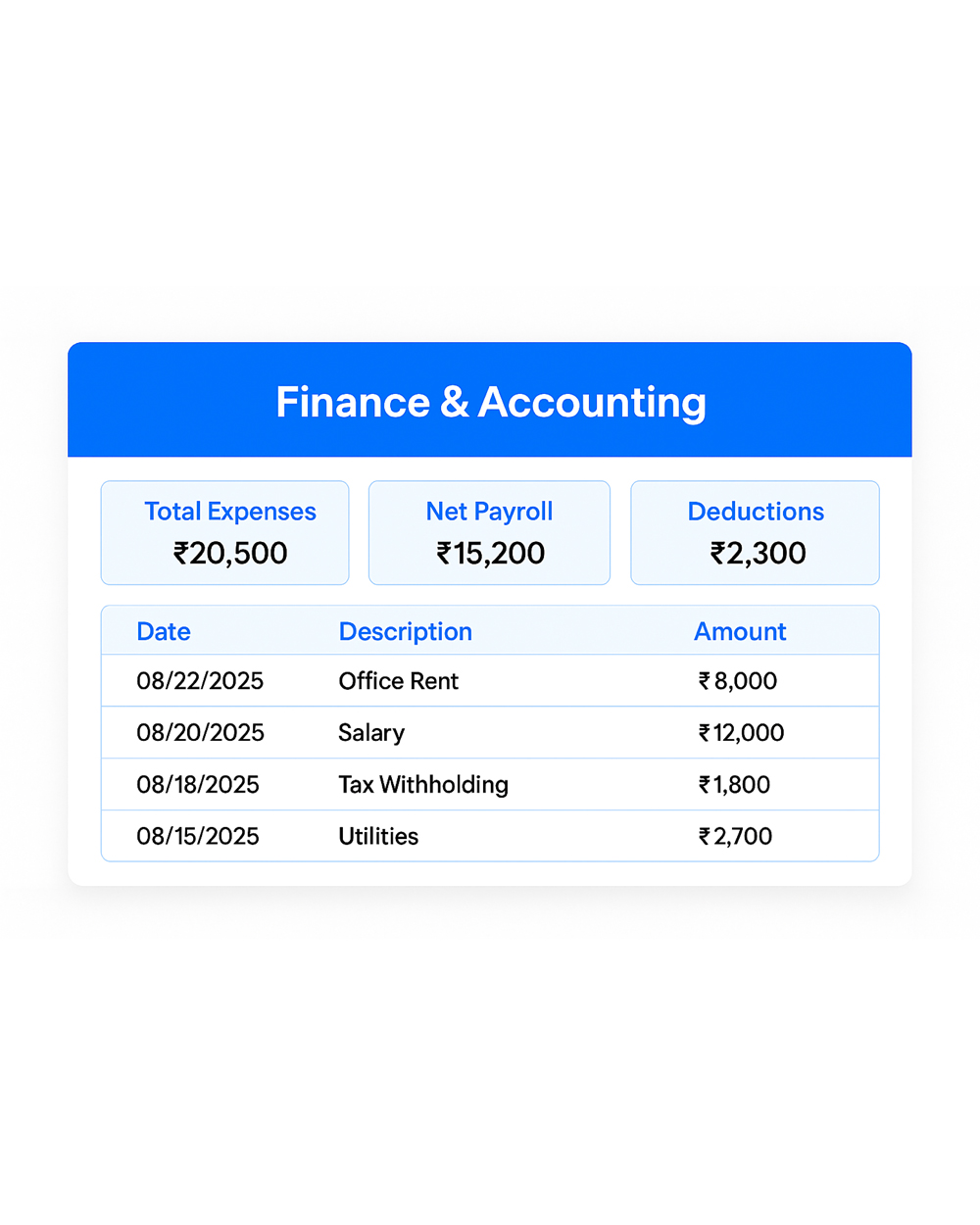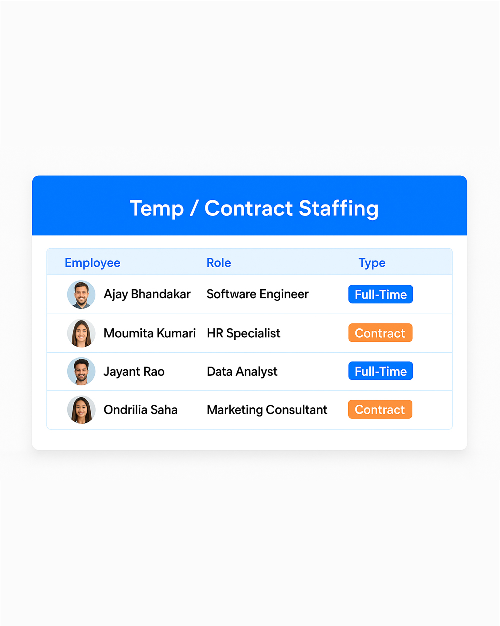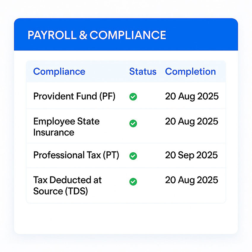 End-to-end compliance with PF, ESI, TDS, and Labour Laws.